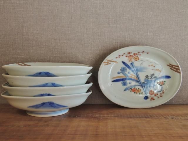 楕円形で深さもあり、普段使いによいお皿です。 扇のに水仙の図、派手すぎない色絵がよい雰囲気です。 5枚セットでお願いします。 商品は古いものですので購入は慎重にお願いします。 わからないことは必ず質問してください。 高さ約4cm、径17.5×13cm 最近チェックした商品