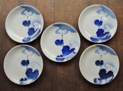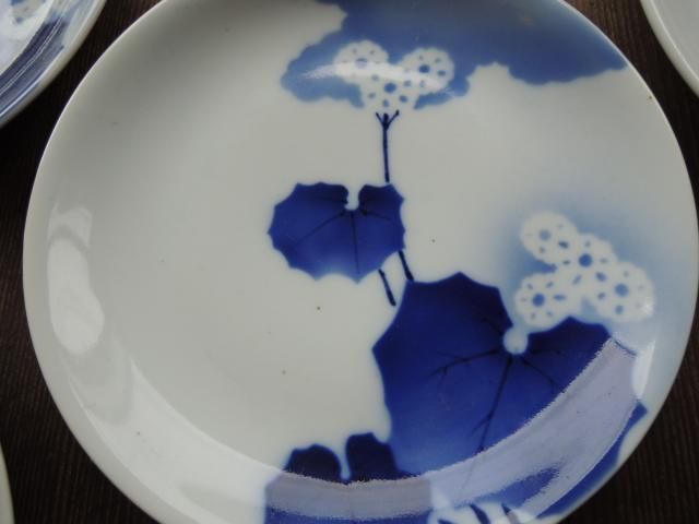 上品なツワブキの模様です。 少し黒っぽい上がりのものと青っぽい上がりのものがあります。 表面の擦れは多少ありますが無傷です。 5枚セットでお願いします。 商品は古いものですので購入は慎重にお願いします。 わからないことは必ず質問してください。 径21.5cm 最近チェックした商品