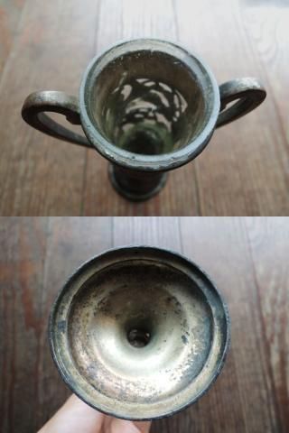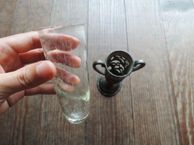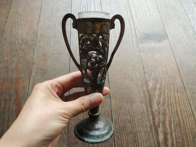 アンチモニーの枠にガラスの容器がついています。 ガラスは欠品していることが多いのですが割れずに残っていてうれしいです♪ 台座部分が少し歪んでいるためガタつきがあります。 経年の痛み、汚れはそれなりにあります。 商品は古いものですので購入は慎重にお願いします。 わからないことは必ず質問してください。 高さ15.5cm 最近チェックした商品