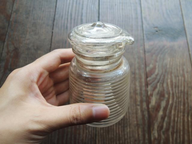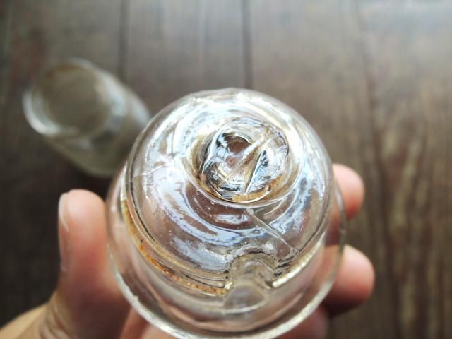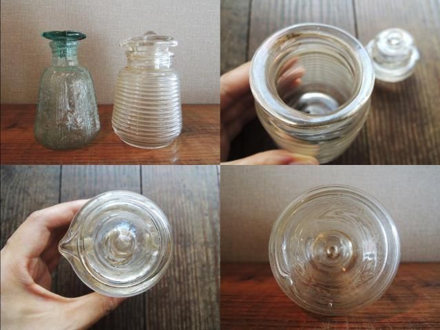 蓋がなければしょうゆ瓶とわからないような大きな蓋がついています。 蓋は型吹きで中が空洞になっています。 シンプルな瓶ですが珍しいと思います。 商品は古いものですので購入は慎重にお願いします。 わからないことは必ず質問してください。 高さ10cm (2本並んだ写真は大きさ比較です) 最近チェックした商品