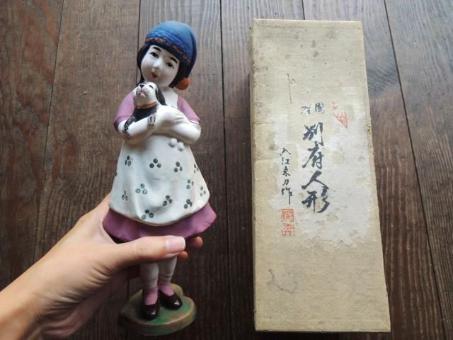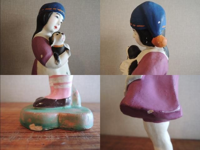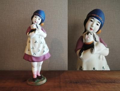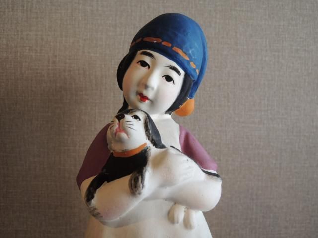 大ぶりな土人形で犬を抱いたかわいらしい少女です。