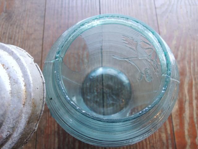ひな菊模様と窓のついたあめや瓶で、底には麻葉模様のようなエンボスもあります。